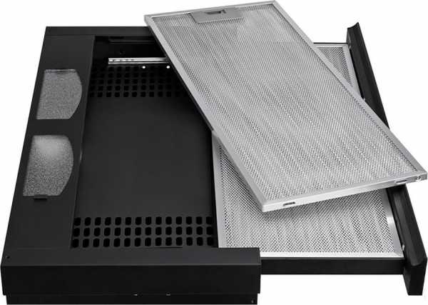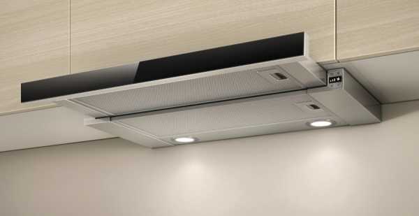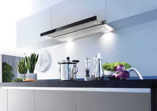 Большинство встроенных вытяжек обладает прямоугольной формой, что делает установку гораздо проще. Касательно ширины, существуют разные размеры, которые подойдут под любой кухонный шкаф.