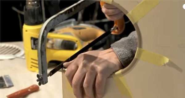 - Вначале только примерьте корпус хлопушки и сделайте разметку на шкафу для отверстия. После этого можно снимать шкаф со стены и вырезать в нижней стенке электролобзиком отверстие под обрамление. Для этого просверлите отверстие внутри области разметки большим сверлом, а затем вставьте в него пилку лобзика и начинайте вырезать нужную вам форму в шкафу.