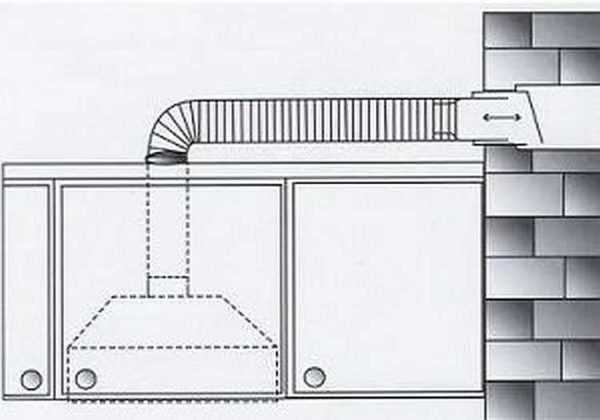 В этом случае можно откорректировать расположение плиты. Оно должно быть максимально приближено к отверстию домовой вентиляционной системы. Удаление в сторону, даже на несколько десятков сантиметров, повлечет за собой усложнение конструкции воздухоотводящего канала, который будет занимать внутреннее пространство подвесных полок.