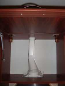 При установке и подключении встроенной вытяжки в шкаф можно заказать готовую конструкцию, которая не имеет дна, или же сделать шкафчик из имеющегося самостоятельно.