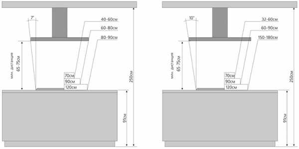 Стоит отметить еще один фактор, которого следует придерживаться – дистанция между плитой и вытяжкой. Важно, чтобы детали устройства располагались на безопасной дистанции друг от друга. Если вытяжка будет расположена слишком близко, детали будут портиться значительно быстрее, и существует вероятность, что пластиковые детали (копки или покрытия) расплавятся. Если размещать на большом расстоянии, производительность будет снижена, прибор не будет нормально впитывать запахи, что делает ее абсолютно бесполезной.
