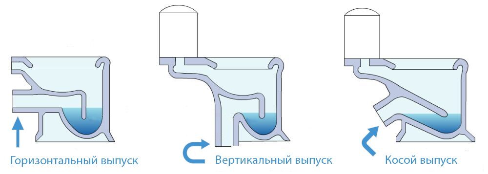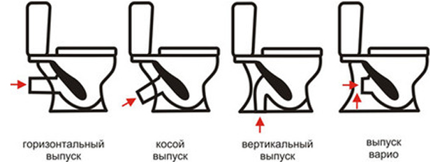 Если рассматривать, как устроен унитаз по данным параметрам, то выпускают оборудование с вертикальным, горизонтальным, а также с косым отводом. Выбор той или иной конструкции зависит от канализационного входа на трубе в квартире и его расположения.