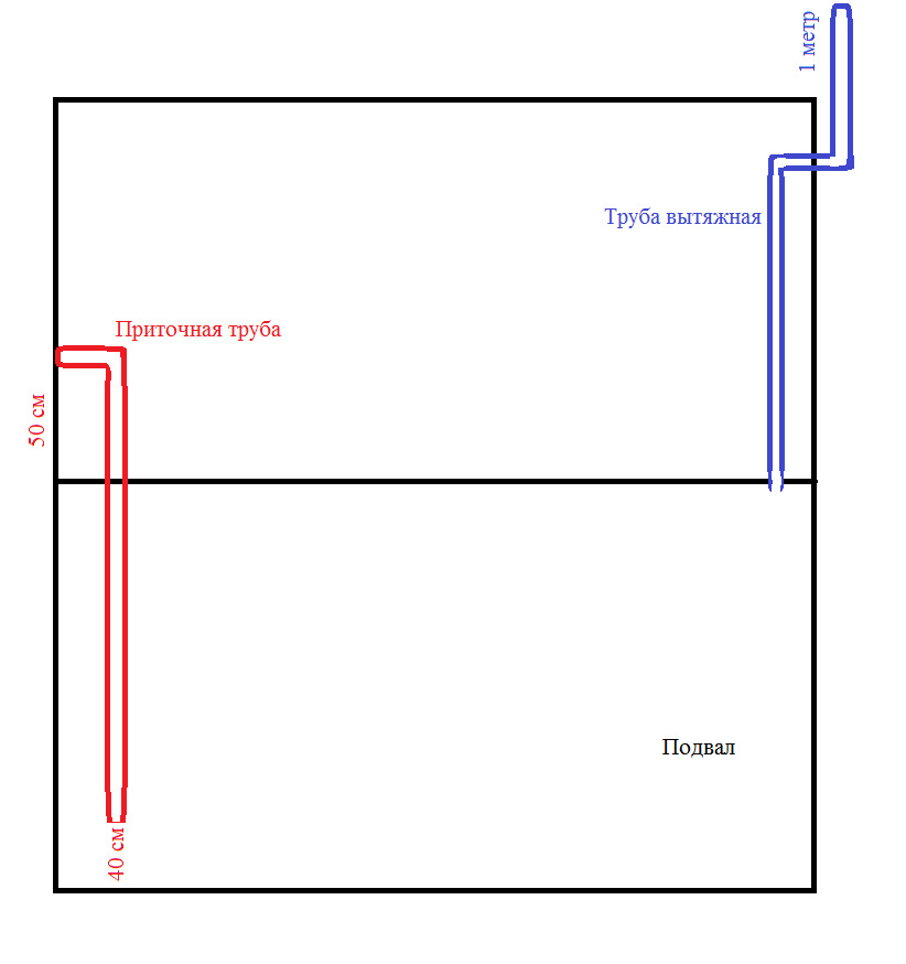 Важен и уровень расположения приточной и вытяжной трубы. Свежий воздух всегда прохладнее. Поэтому приточный канал следует размещать внизу, недалеко от пола. Вытяжное отверстие идеально разместить прямо под потолком. Пройдя через подвальное помещение, кислород нагревается и поднимается вверх.