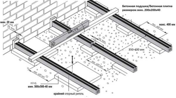 Расстояние между брусьями на полу не должно превышать 60 см.