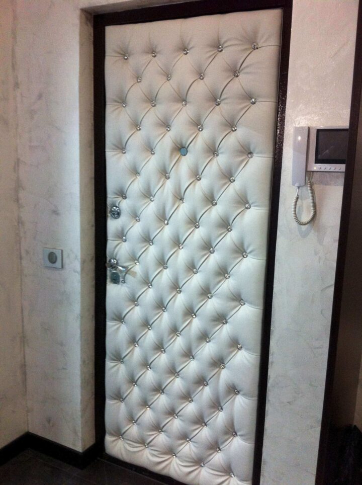 Оформление входной двери изнутри выполняет несколько функций. Это защита утеплителя от механических воздействий и других повреждений, дополнительная тепло- и шумоизоляция, а также декоративная составляющая.