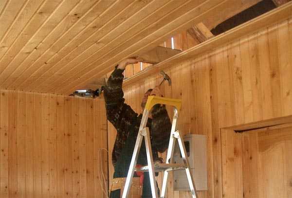 - Прикрепить к потолку деревянные бруски размеров 5 на 5 см.