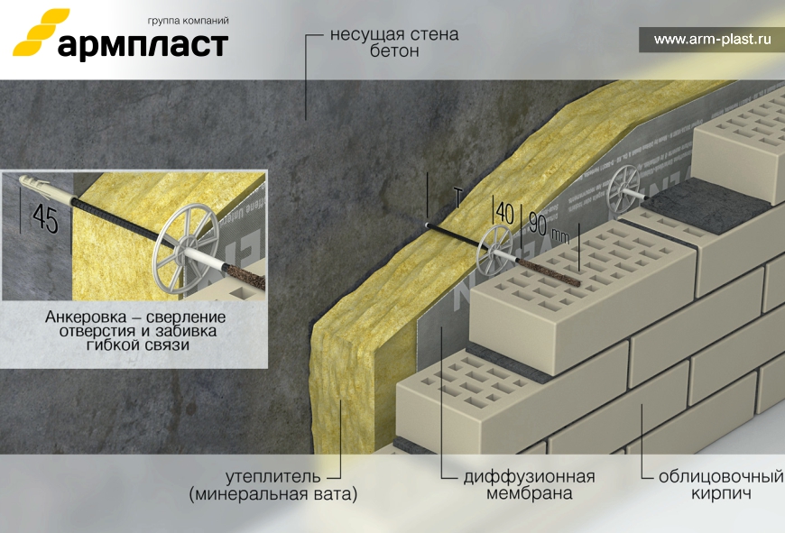 Для выбора метода крепления учитывают температурные показатели, нагрузку на стену, постоянную влажность и другие факторы, влияющие на вид крепежа и на теплоизоляцию.