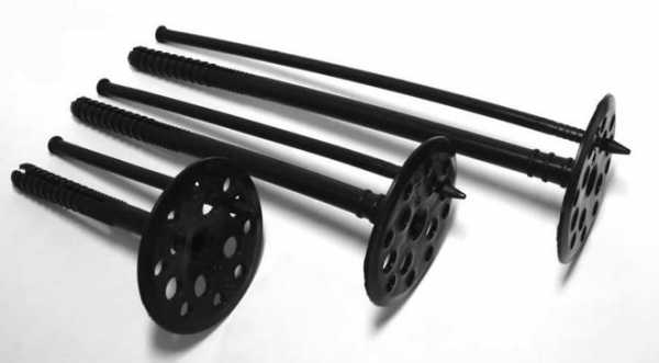 Дюбельные крепежные изделия несут большую ответственность за всю систему теплоизоляции, на них падает вся нагрузка веса теплопирога. После клейки изоляции (через сутки) все плиты крепятся дюбелями, по 4 штуки на одну плиту, на углах применяются по 8 штук. Их длина зависит от толщины плиты.