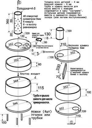 В качестве нижней емкости подойдет старый баллон или металлический ящик. В нем необходимо выполнить отверстие с заслонкой, регулирующей подачу воздуха. Через это отверстие будет заливаться отработка. Посредине нижнего резервуара прорезается отверстие, равное диаметру привариваемой соединительной трубы. В этой металлической трубе проделываются около 50 отверстий по 1 см для поступления воздуха. Ее верхняя часть соединяется со вторым резервуаром. Эта часть конструкции не крепится сваркой, ее необходимо периодически разбирать для чистки. Нагревательный элемент печки раскаляется до 800 градусов, поэтому для длительной эксплуатации потребуется толстая до 6 мм сталь. Сверху в резервуаре прорезается отверстие и приваривается патрубок для дымохода.
