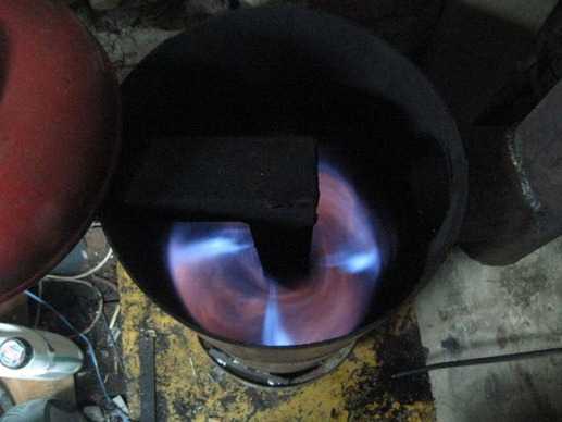 Самодельная капельная печка из трубы может работать и на малой тяге, если нет никакой возможности поднять дымоход повыше. Этому способствует установка вентилятора, нагнетающего воздух внутрь дожигателя. Тогда, заглянув в работающую печь сверху, можем наблюдать такую картину: