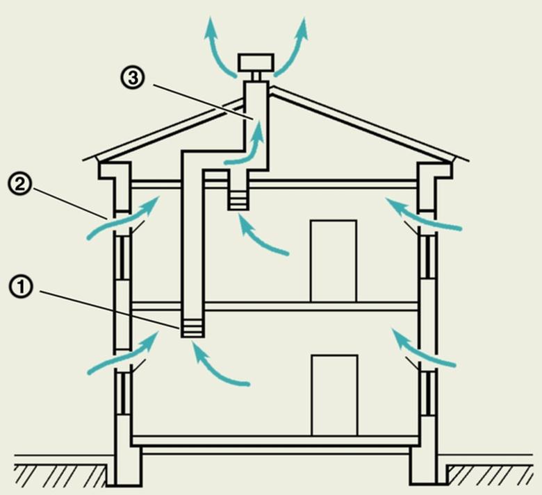 Идея проста: ориентировать вход притока лучше на сторону, откуда часто дует ветер, а выход вытяжки — на противоположной стороне или через крышу по высокой трубе.