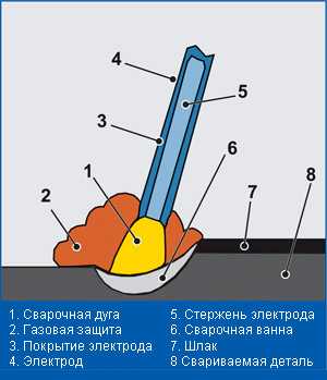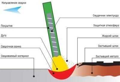 Покрытие электрода, так называемая обмазка, при расплавлении образует особую газовую зону в районе дуги и над ванной. Она вытесняет весь воздух из области сварки и препятствует взаимодействию расплавленного металла с кислородом. Кроме того в ней находятся пары как основного, так и электродного металлов. Поверх шва образуется шлак, который так же препятствует взаимодействию расплава с воздухом, что отрицательно сказывается на качестве сварки. После постепенного удаления электрической дуги металл начинает кристаллизоваться и образуется шов, объединяющий свариваемые детали. Поверх него расположен защитный слой шлака, который впоследствии убирается.