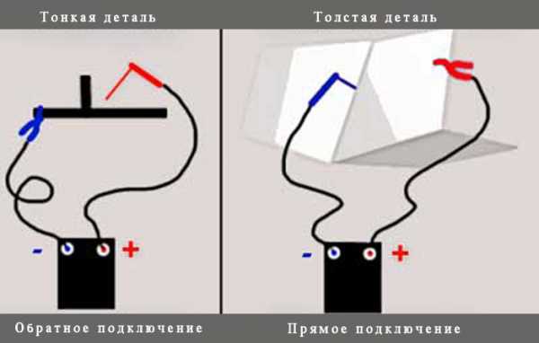 К тонким изделиям крепят отрицательную клемму. Данный метод подключения имеет название обратная полярность.
