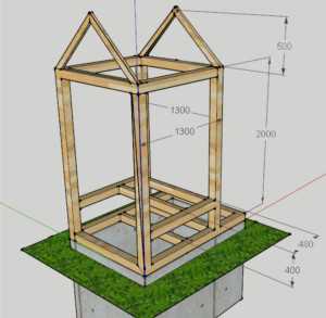 Далее своими руками возводится домик. Самая простая конструкция — «скворечник», лучше всего остановиться на ней. Схема каркаса с приблизительными размерами указана на фото. Последовательность сборки деревянного туалета такая: