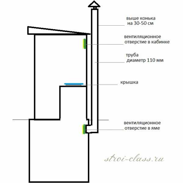 Если все сделать правильно, то вентиляция будет тянуть воздух из помещения вниз, в яму, а затем выталкивать его через канал вверх и запаха в туалете практически не будет.