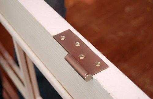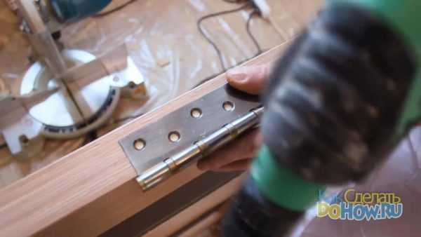 Заключительным этапом на данном шаге является установка петель. В намеченных местах, по аналогии с установкой замка, в торцах крепятся петли. Как и для замка, фрезерной пилой удаляется слой древесины, чтобы прикрепляемая поверхность петли была в одном уровне с дверным полотном.