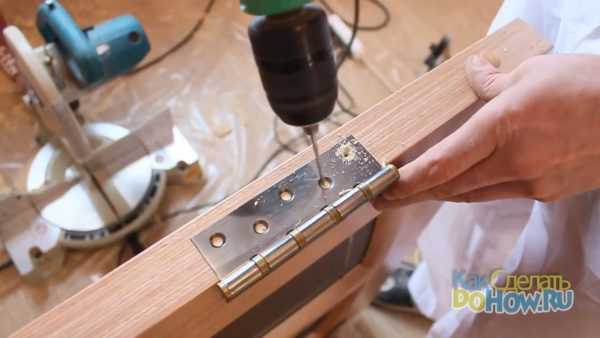 Наживите петли на двери и коробку, закрепив одним саморезом, чтобы можно было регулировать установку.