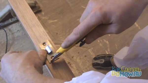 Обратите внимание, что диаметр отверстия должен превышать внутреннюю толщину защёлки. Нанесём отметки с помощью ножа.