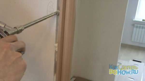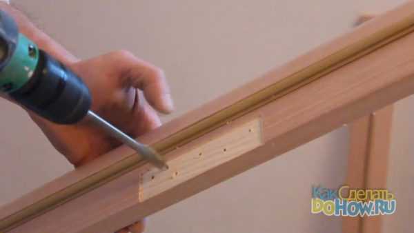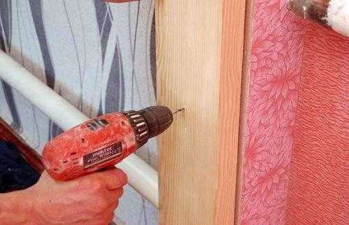 После этого следует закрепить дверной блок к перегородкам. Для этого необходимо просверлить отверстия диаметром 6 мм в выступающей части деревянных перемычек. Затем в эти отверстия забиваются дюбели. В процессе фиксации дверного блока необходимо время от времени проверять положение конструкции относительно боковых стен.