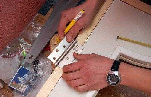 Отметьте место для петель, отступив от краев двери по 20 см. Приложите петли и сделайте отметки на коробке и полотне.