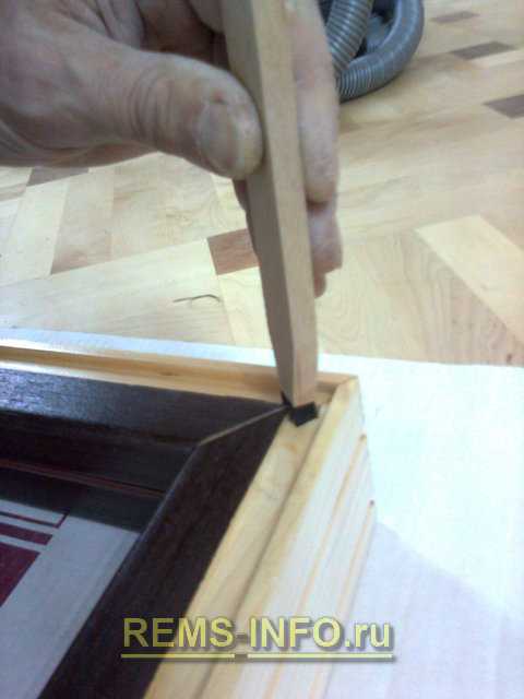 Эти вставки необходимо выбить, но делать это следует крайне аккуратно, чтобы не повредить поверхность дверной коробки. Для этого лучше всего использовать деревянный колышек, а не бить молотком сразу по вставке.