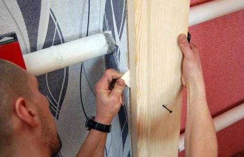 Отмерив ширину по низу коробки, фиксируем её деревянной планкой. Прикручиваем её шурупами в местах, которые впоследствии будут заделаны раствором в стену. Шуруп в данном случае следует начинать вкручивать не с самого края планки, так как в месте скрепления вы лишь расщепите планку. Вкручиваем под углом примерно так, как показано на фотографии.