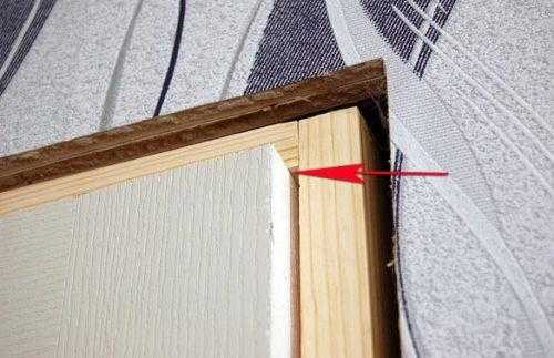Установим доски добора в освобождённый паз. Для фиксации добора необходимо расклинить его в верхних углах дверной коробки.