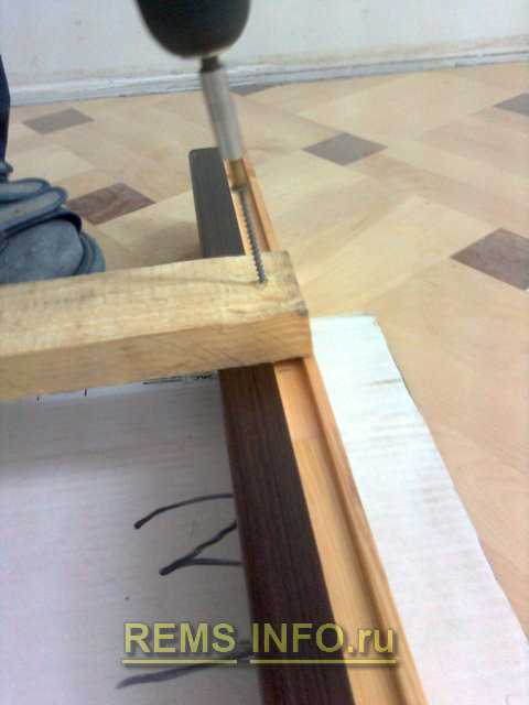 Закручиваем саморезы по дереву в элементы коробки. Здесь важно точно совместить детали и не допустить их взаимного смещения. Если всё сделано правильно, мы получим идеальный угол. С другой стороны выполним те же операции.