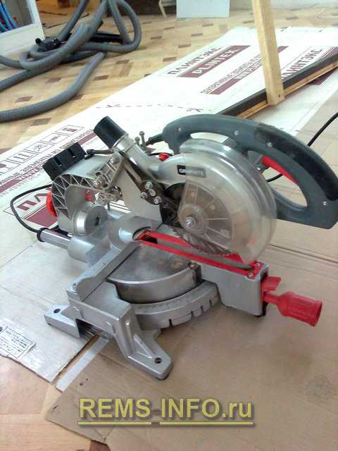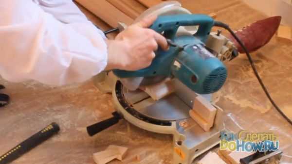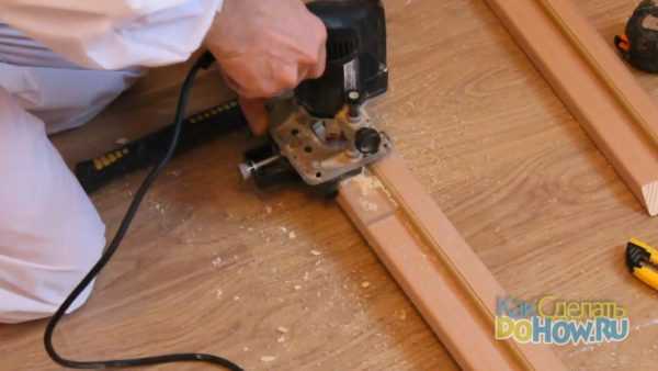 Теперь нам очень пригодится циркулярная пила с верхним столом. Выставив упор на заданную ширину, мы идеально обрезаем доски добора. Отторцуем нижний край добора.
