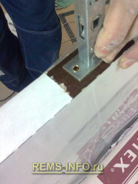 Закрепите стойку саморезами длиной 75 мм, подложив в этих местах деревянные прокладки, чтобы не прогнулась коробка.