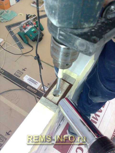При сверлении отверстия под защёлку надо не повредить лишний шпон. Для этого устанавливаем вращение дрели против часовой стрелки и наносим сверлом центральную разметку. Так сверло не соскочит и не порвёт соседний шпон. Затем устанавливаем дрель в режим обычного сверления и сверлим необходимое отверстие. Глубина сверления может регулироваться по специальному маркеру, который вы нанесёте на сверло. Маркером в данном случае является обычная изолента.