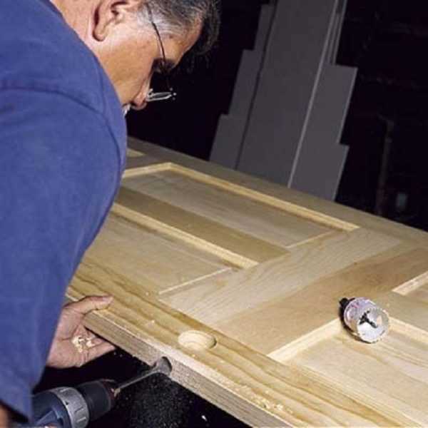 Начинается сверление под углом, опираясь на край петли, затем сверло устанавливается вертикально, и мы сверлим ровно по центру. Эта простая методика позволяет без труда сверлить отверстия по центру петель. Наносим разметку для установки дверной защёлки. Обычно она приходится на середину двери.