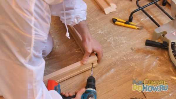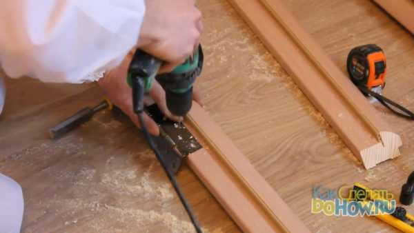 Выполнив все описанные действия в шаге 3 и, соединив, тем самым, верх дверной коробки, мы можем перейти к её нижней части. Используется для этого тот самый дополнительный элемент комплекта – фиксирующая деревянная планка.