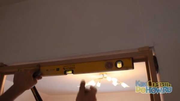 На этом этапе мы приступаем к непосредственной установке дверной коробки в проем. Для этого нам необходимо выставить в проеме дверную коробку идеально ровно. Сделать это можно при помощи уровня. После этого прикручиваем коробку к проему. В нашем конкретном случае можно использовать обыкновенные шурупы по дереву, так как в проеме из гипсокартонных листов заложены деревянные бруски. В других случаях придется использовать дюбель-гвоздь и т.п. материалы.