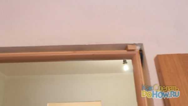 Размещаем доску добора, упирая её в верхний паз дверной коробки.