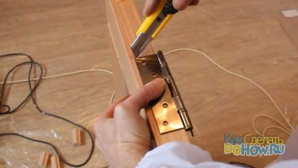 Стамеской сделайте выборки по контурам на такую же глубину, как толщина пластины петли, которая должна войти в выборку заподлицо.