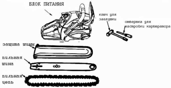 Основу любой бензопилы составляет двухтактный двигатель. Редуктора нет, пильную цепь заставляет вращаться одноступенчатая цепная передача. Современные модели в обязательном порядке оснащены системой очистки воздуха, поступающего в карбюратор, натяжным механизмом для цепи, стартером, глушителем, катушкой зажигания, шиной, топливным баком и рядом других элементов.