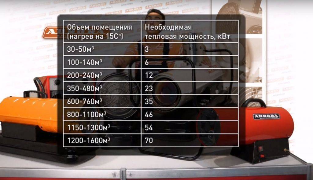 Специалисты пользуются сложной системой формул для подсчета оптимальной мощности теплопушки – в ней учитываются габариты помещения, разница температур внутри и снаружи, коэффициент теплопроводности.