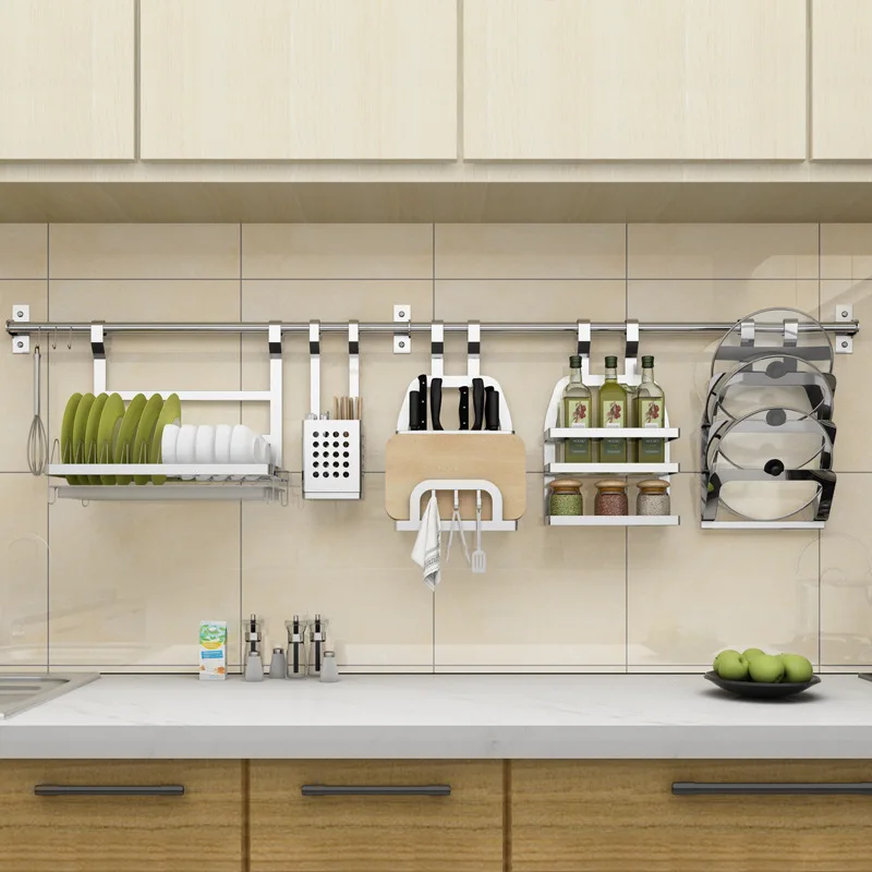 Рейлинговая система – навесная мобильная конструкция, позволяющая сохранить пространство в кухонной зоне.