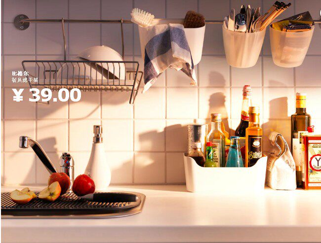 В этом случае на нем можно будет расположить все те предметы, которые обычно стоят на рабочей поверхности, освободив ее. - Для кухонь с угловой мойкой можно использовать специальный элемент, который крепится на рейлинг и становится удобной полочкой для бытовой химии.