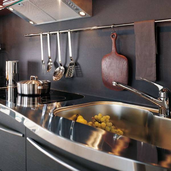 Рейлинг может стать настоящим украшением кухни, ее изюминкой. Также стоит отметить, что он может размещать на себе достаточное количество необходимых предметов, но при этом не отнимает пространство, как шкаф, содержащий столько же вещей.