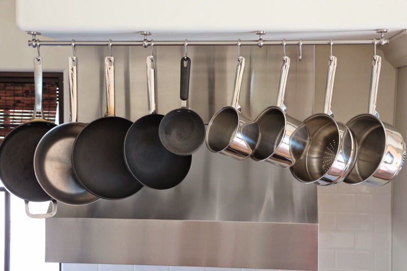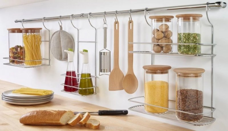 Под замысловатым словом «рейлинг» скрывается вполне простая конструкция. Это металлическая штанга, прикрепленная к стене. На ней можно разместить половники, дуршлаги, бумажные полотенца, крышки кастрюль, даже бутылки с маслом и прочую утварь, а возможно это благодаря разнообразной навесной фурнитуре.