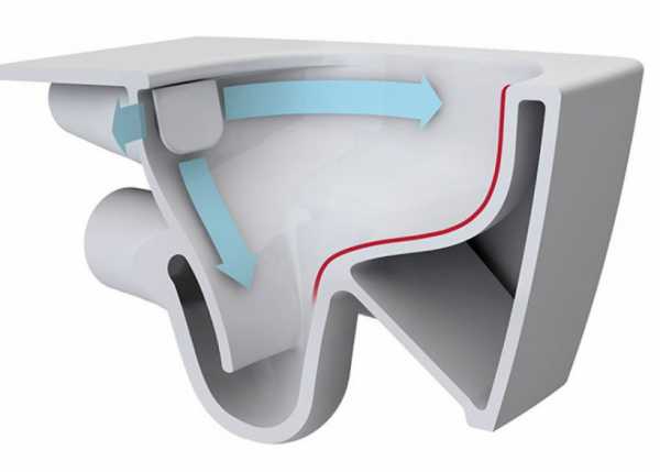 Благодаря специальным каналам, создается воронка в чаше, засасывающая все содержимое. Поток совершает круговое движение, направляясь под определенным углом из одной точки. Достоинства: небольшие звуковые колебания жидкости, хорошая очистка. Недостаток – забиваются выходы для воды, высокая стоимость.