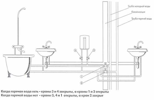 - Накопительный обогреватель обеспечивает подачу горячей воды во все водоразборные точки. Один бойлер может обслуживать ванную комнату, кухню и душевую кабину.