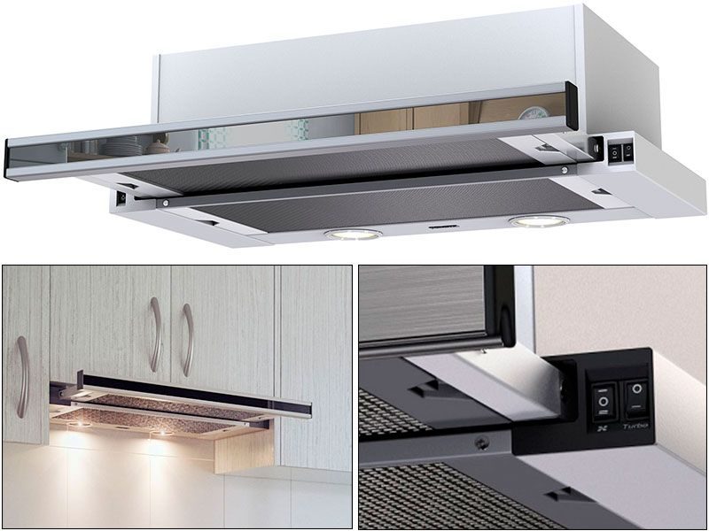 Полуинтегрированный и почти невидимый, когда он не используется: видна только передняя панель толщиной 5-8 см. Некоторые выдвижные вытяжки предлагают отличное соотношение цены, внешнего вида и производительности.