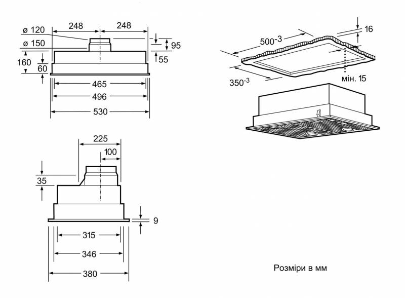 Ширина вытяжки определяется шириной варочной поверхности, над которой она монтируется, — она должна быть как минимум такой же. Более широкие лучше захватывают все испарения, которые поднимаются над варочной панелью в процессе готовки. Из этих же соображений вытяжку следует размещать симметрично, не сдвигая в сторону.