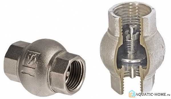 Шаровые обратные клапаны используются чаще всего в сантехнике. Обратный подъёмный устанавливается только вертикально. Также такое устройство чувствительно к чистоте окружающей среды.