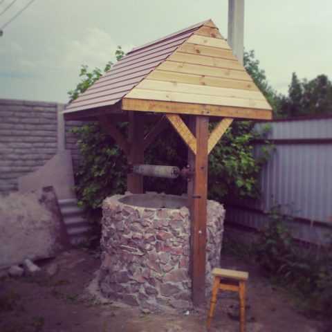 Завершающим этапом строительства колодца своими руками является обустройство его верхней части. Устройство для поднимания воды на поверхность состоит из деревянного ворота с металлической ручкой, к которому крепится шнур или трос с ведром на конце. Как будет выполнена вершина колодца — дело уже вашего вкуса.
