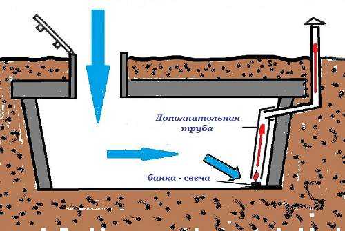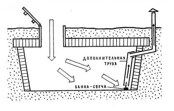 В случае, если погреб находится на некотором удалении от основных построек (отсутствует электроэнергия), то произвести его просушку можно при помощи обычной свечи. Для чего предварительно к вытяжной трубе (находящейся под потолком) временно добавляется сегмент аналогичной трубы с таким условием, чтобы его торец не доходил до пола на 5 – 10 см. Далее под эту трубу на негорючей подставке устанавливается зажженная свеча, которая прогревая воздух, обеспечивает хорошую его циркуляцию (теплые потоки стремятся вверх). После прогорания свечи следует установить новую и таким образом добиться качественного выведения влаги из овощехранилища. Порой, дабы получить движение воздушных масс, энергии свечи бывает недостаточно, и тогда в начальный момент под трубу можно поднести зажженную бумагу или сухой спирт. А уже после – использовать свечу.