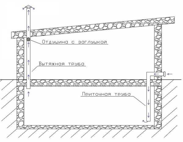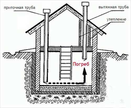 Вентиляция погреба. Позволяет обеспечить непрерывный воздухообмен в помещении и отводить избыточную влагу наружу вместе с воздухом. Для этих целей можно использовать трубы (диаметром около 100 мм), которые монтируются в противоположных углах сооружения и устанавливаются таким образом, чтобы торец приточной трубы располагался на возвышении от пола 10 – 15 см. А торец вытяжной трубы располагался на удалении от потолка на 10 – 15 см. Тогда как ответные части трубопроводов должны быть выведены на улицу. Вдобавок желательно соблюдение следующих условий: